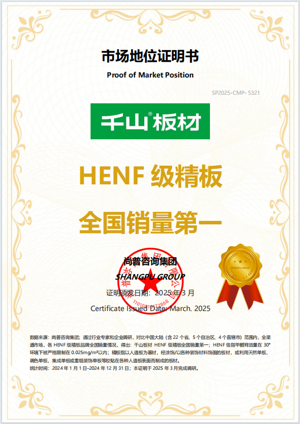 千山實力,權威認證! 千山板材獲頒“HENF級精板全國銷量第一”認證證書