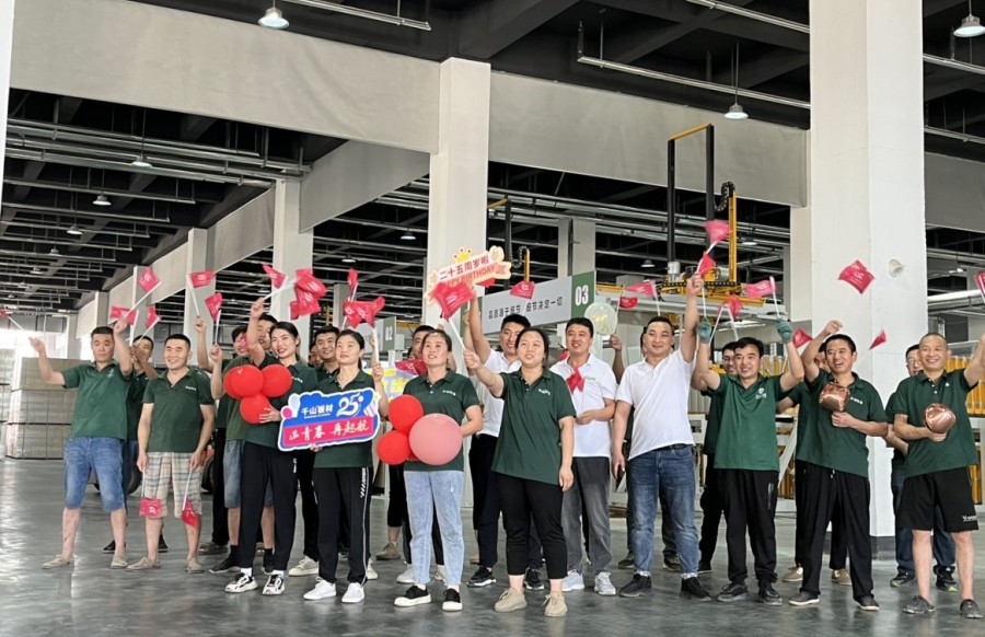 “祝千山25周年生日快樂”、“時尚潮派衣柜 就選千山板材”的嘹亮口號響徹活動現(xiàn)場,大家意氣風(fēng)發(fā),自信昂揚,展現(xiàn)了千山人新時代踔厲奮進(jìn)、拼搏進(jìn)取的精神。