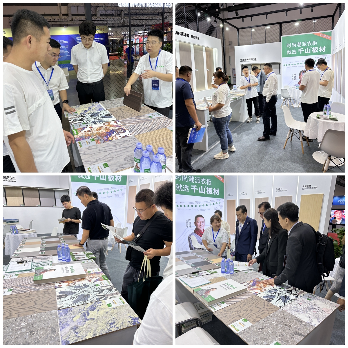 為更好的服務個性化定制和高端用戶的需求,滿足多樣化的家裝場景,千山在此次展會現場新推出了19款高定系列板材,表面花色采用數碼打印,環保等級為ENF級,吸引了諸多觀展客戶前來洽談咨詢。