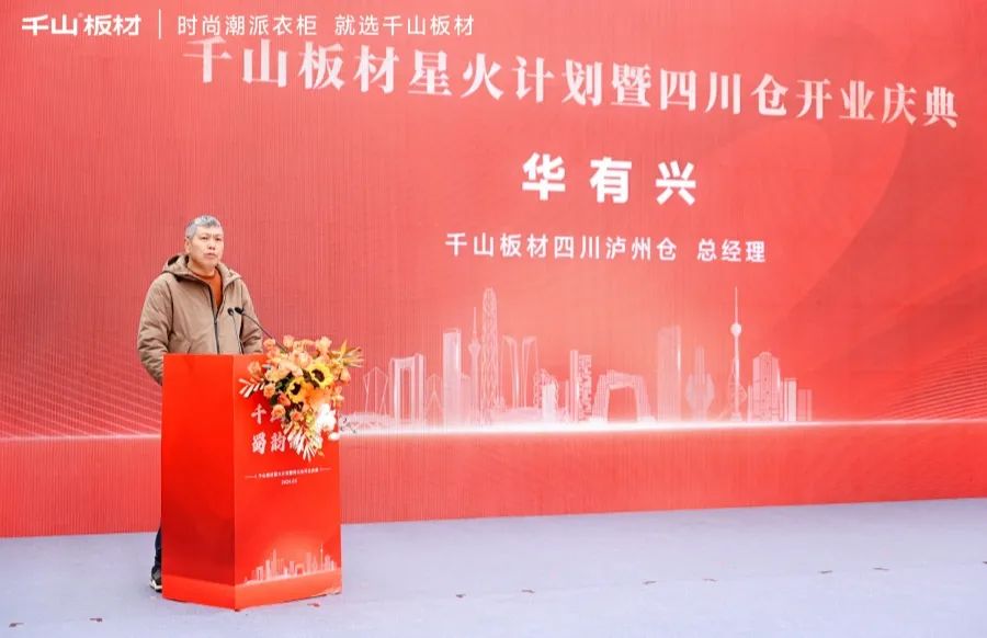 千山板材優(yōu)秀經(jīng)銷商代表,四川瀘州倉(cāng)總經(jīng)理華有興上臺(tái)致辭。華總分享到,在集團(tuán)總部和區(qū)域合作伙伴的支持與努力下,千山板材在瀘州地區(qū)的市場(chǎng)占有率逐年攀升,品牌影響力日益增強(qiáng)。未來,將繼續(xù)加強(qiáng)合作,共同應(yīng)對(duì)市場(chǎng)挑戰(zhàn),實(shí)現(xiàn)互利共贏。