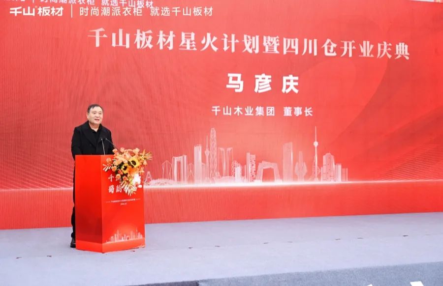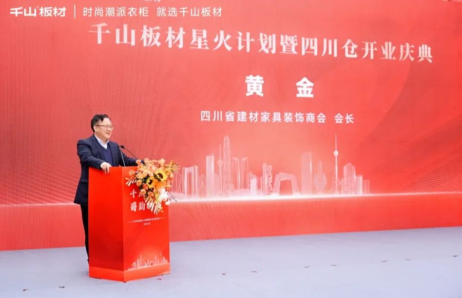 四川省建材家具裝飾商會(huì)會(huì)長(zhǎng)黃金先生發(fā)表致辭。黃會(huì)長(zhǎng)表達(dá)了對(duì)千山板材四川倉(cāng)的美好期許和祝愿,并表示四川家具市場(chǎng)的繁榮與發(fā)展,離不開千山板材等一眾優(yōu)秀供應(yīng)鏈品牌的入駐與支持,也希望四川倉(cāng)合力共上,迎來高質(zhì)量發(fā)展。