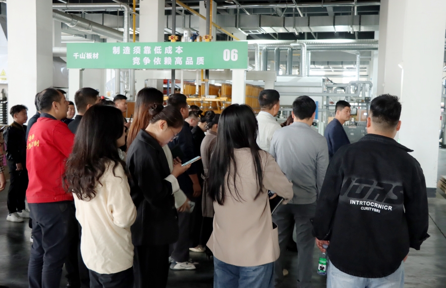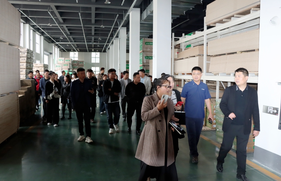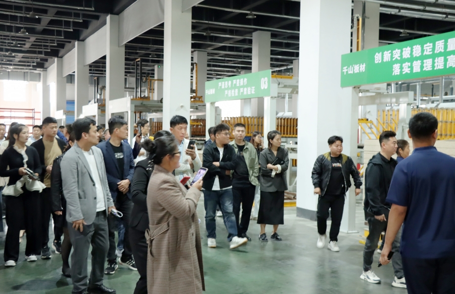 學習會結(jié)束后,王殿忠經(jīng)理帶領大家參觀了千山的現(xiàn)代化生產(chǎn)工廠,從板材品類、生產(chǎn)工序、檢驗出廠等方面深入了解板材生產(chǎn)環(huán)節(jié)。