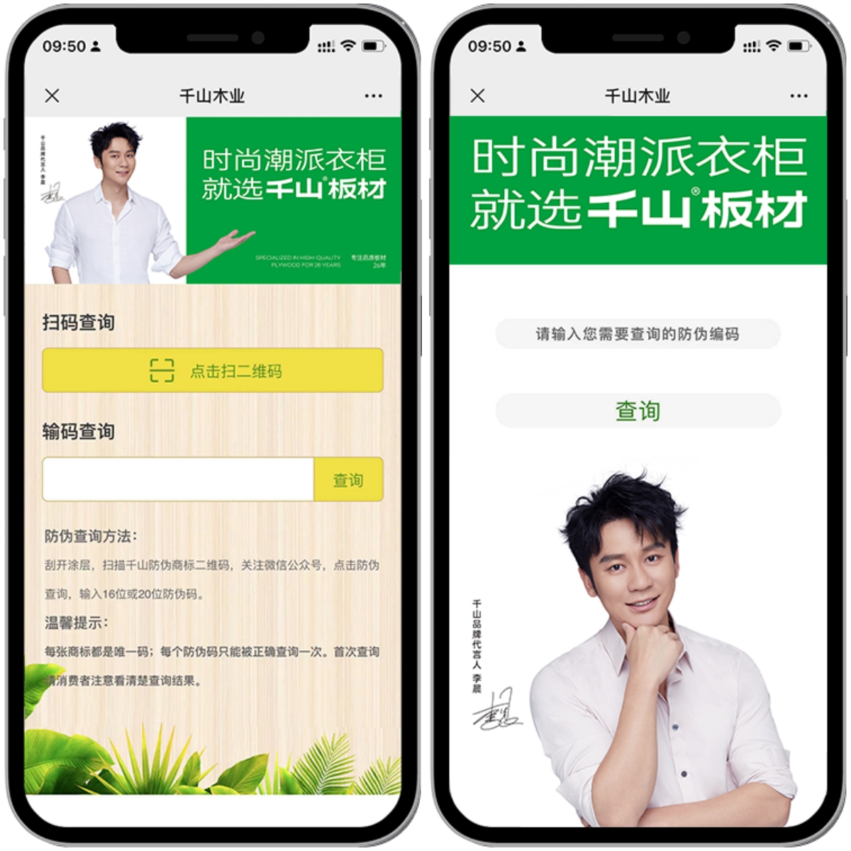 刮開(kāi)二維碼涂層,關(guān)注微信公眾號(hào)「千山板材」,點(diǎn)擊底欄「防偽查詢」,選擇「板材」或者「輔料」,掃描二維碼或者輸入商標(biāo)防偽碼,查詢即可。