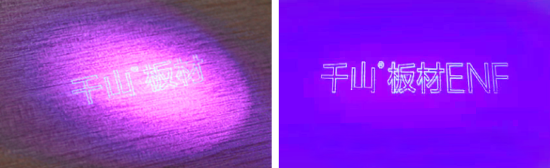 千山板材每張板材表面都印有隱形防偽標(biāo)識(shí),使用紫光手電筒照射板材表面,顯現(xiàn)“千山板材”  “千山板材ENF”。
