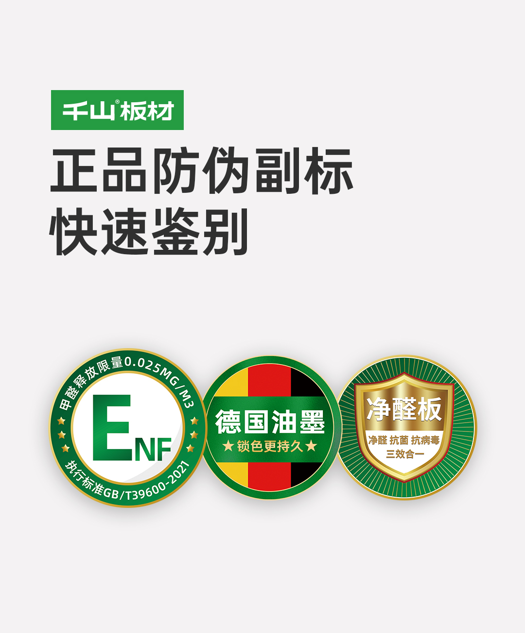 正品千山板材表面都印有隱形防偽標識,使用紫光手電筒照射板材表面,顯現“千山板材” 或 “千山板材ENF”水印,凈醛板顯現“凈醛 抗菌 抗病毒”水印。