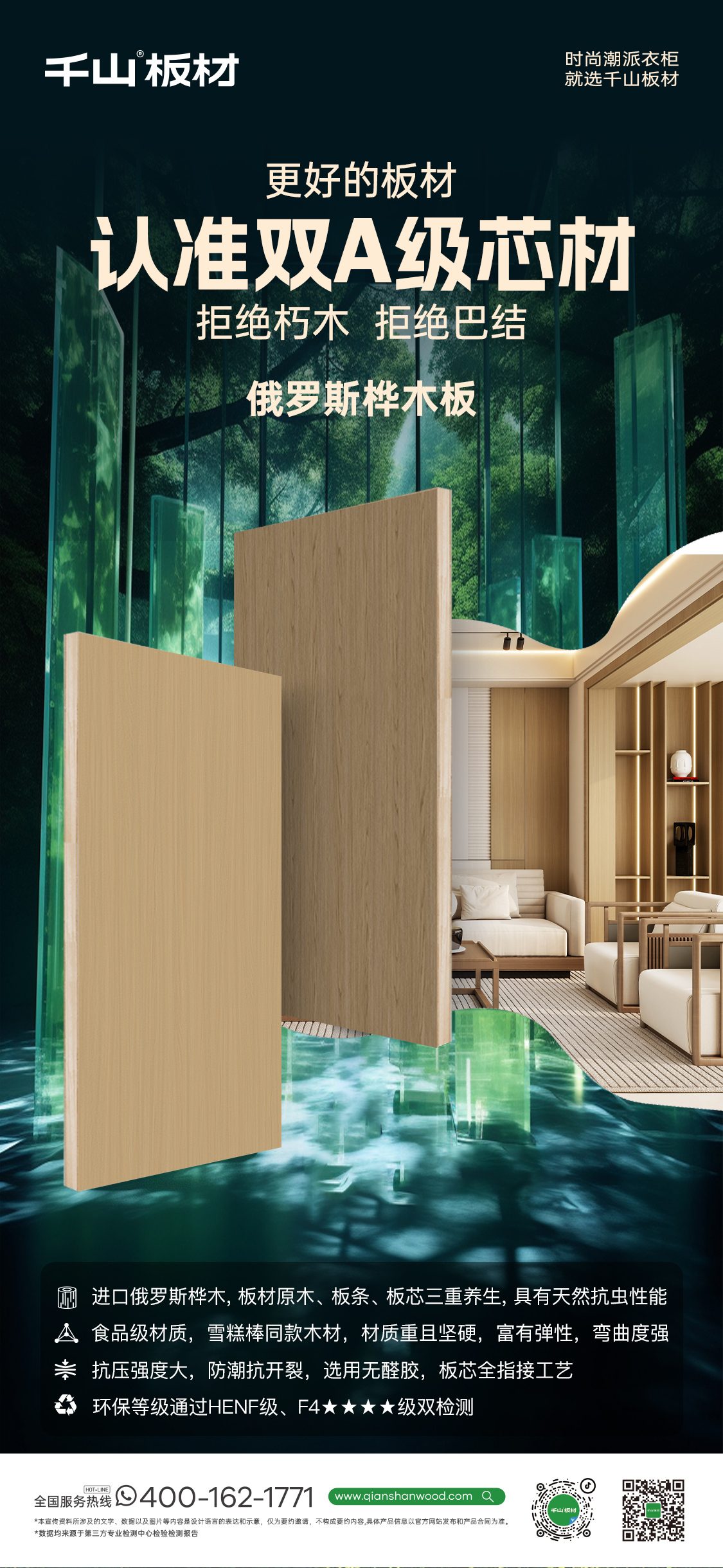 千山俄羅斯樺木板,實木方料,質地純正,雙A級芯材將高品質感拉滿,成為健康環保、高端品質的雙全選擇。